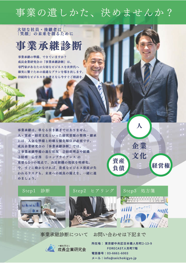 HOPの事業承継診断では、5つの重要指標 ①事業承継準備 ②経営資源(理念・組織) ③経営資源(財務) ④経営資源(労務) ⑤コンプライアンス から会社の現状を診断し、専門家のアドバイスをもとに次の一手を見つけることができます。 お客様、あるいはご自身の大切な会社の未来を見据えて、私たちと一緒に考えてみませんか? ご興味のある方は、ぜひHOPグループまでお問い合わせください。